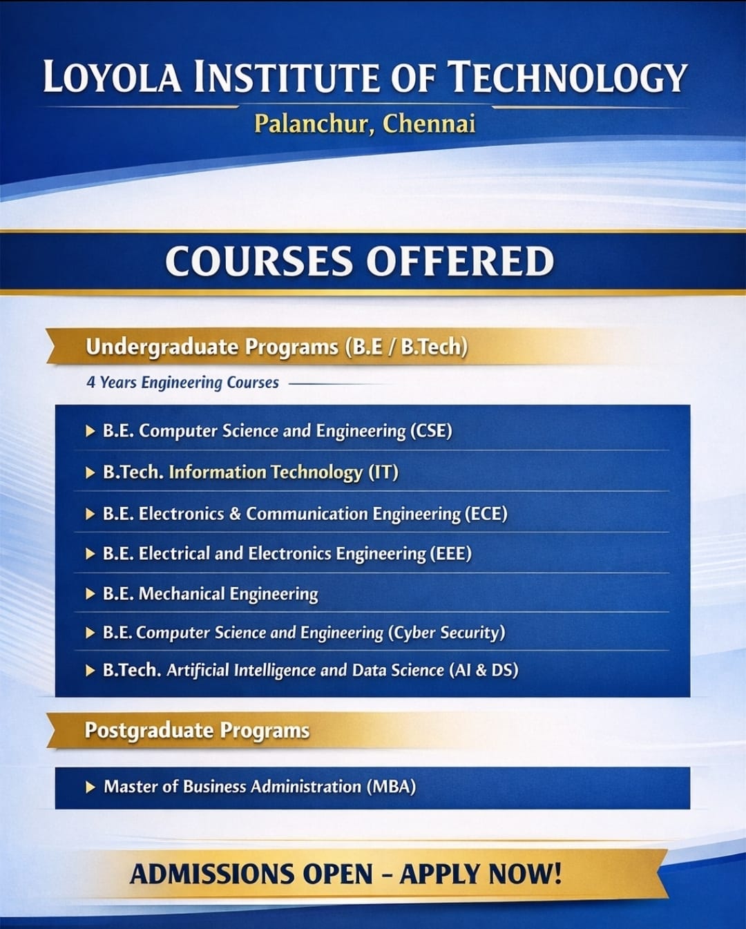 Loyola Institute of Technology has been conferred Autonomous Status by the University Grants Commission (UGC) for a period of 10 years, starting from the academic year 2025–2026 to 2034–2035, as per clause 7.5 of the UGC *************"Stay Connected: Join the Alumni Network - Register Now!" ********Freshers Day 2K25 held on 03.08.2025 at 9:30 a.m.**********