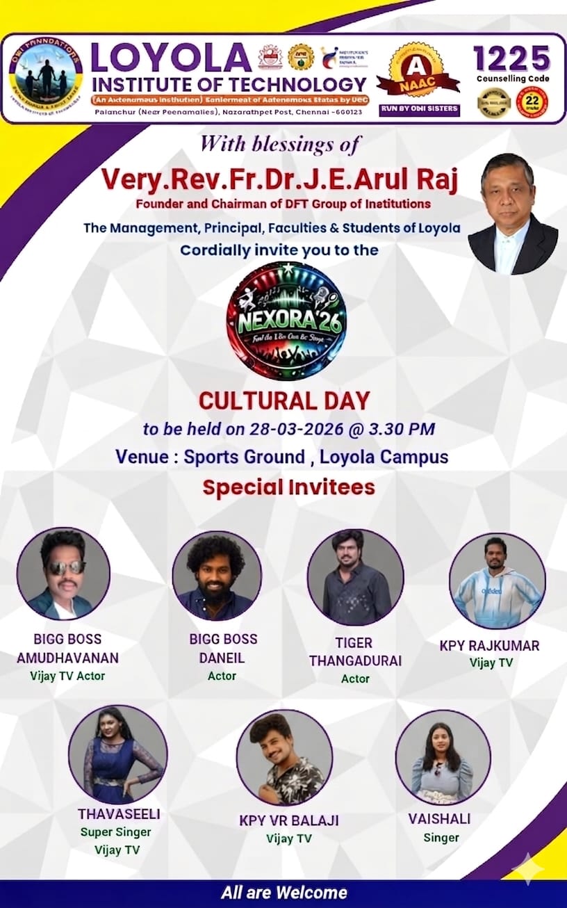 *************We are delighted to announce that Loyola NEXORA 2026, our Cultural Day celebration, will be held on 28th March 2026 at 3:30 PM in the College Sports Ground. *************"Stay Connected: Join the Alumni Network - Register Now!" *************We are immensely proud to announce that